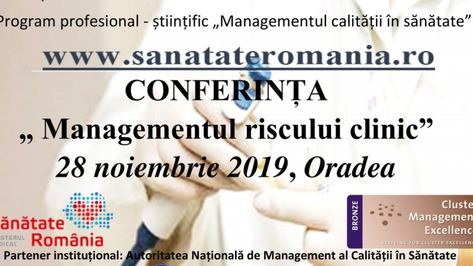 Conferința cu tema “Managementul riscului clinic” de la Oradea se va desfășura în data de 28 Noiembrie 2019, în intervalul orar 09.30 – 17.30.Continuăm astfel seria evenimentelor cu această temă începută la București și continuată la Iași, Târgu-Mureș, Constanța, Timișoara, Brașov și Craiova.